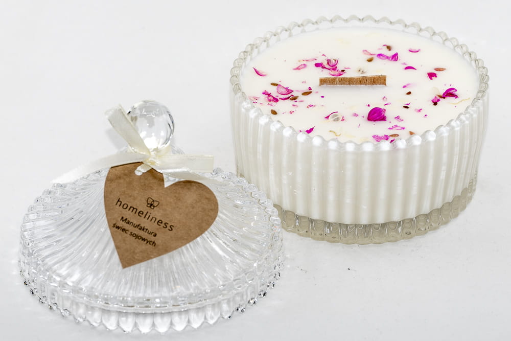 Ze względu na delikatność wosku sojowego, a także całkowicie rękodzielniczy charakter świec, możliwe jest wystąpienie malutkich pęcherzyków, lekkich nierówności czy sporadycznych pęknięć wosku. Absolutnie nie wpływa to negatywnie na jakość i wartość użytkową świecy. Dekoracja powierzchni świecy suszonymi kwiatami może się różnić od dekoracji na zdjęciu.