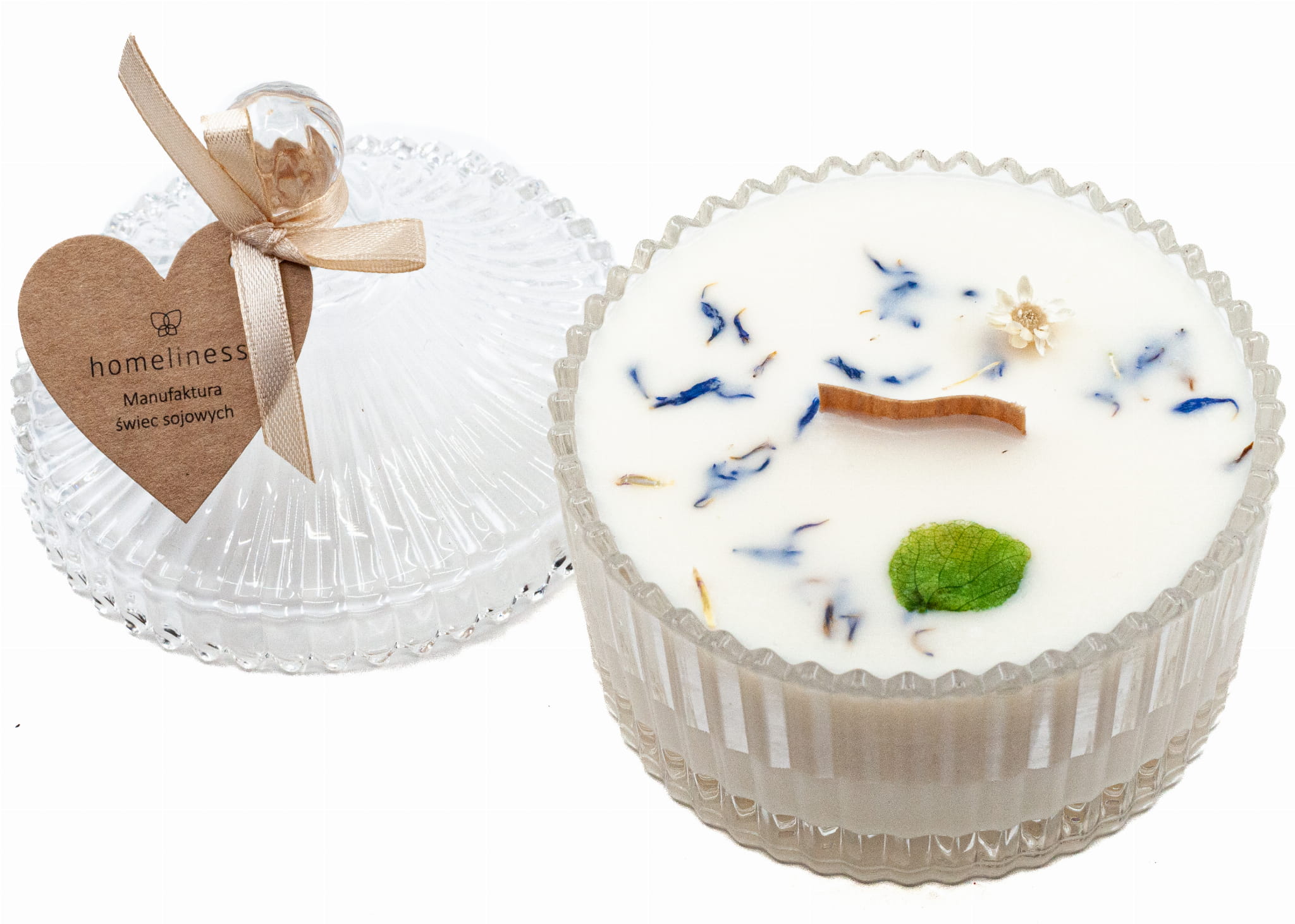 Ze względu na delikatność wosku sojowego, a także całkowicie rękodzielniczy charakter świec, możliwe jest wystąpienie malutkich pęcherzyków, lekkich nierówności czy sporadycznych pęknięć wosku. Absolutnie nie wpływa to negatywnie na jakość i wartość użytkową świecy. Dekoracja powierzchni świecy suszonymi kwiatami może się różnić od dekoracji na zdjęciu.